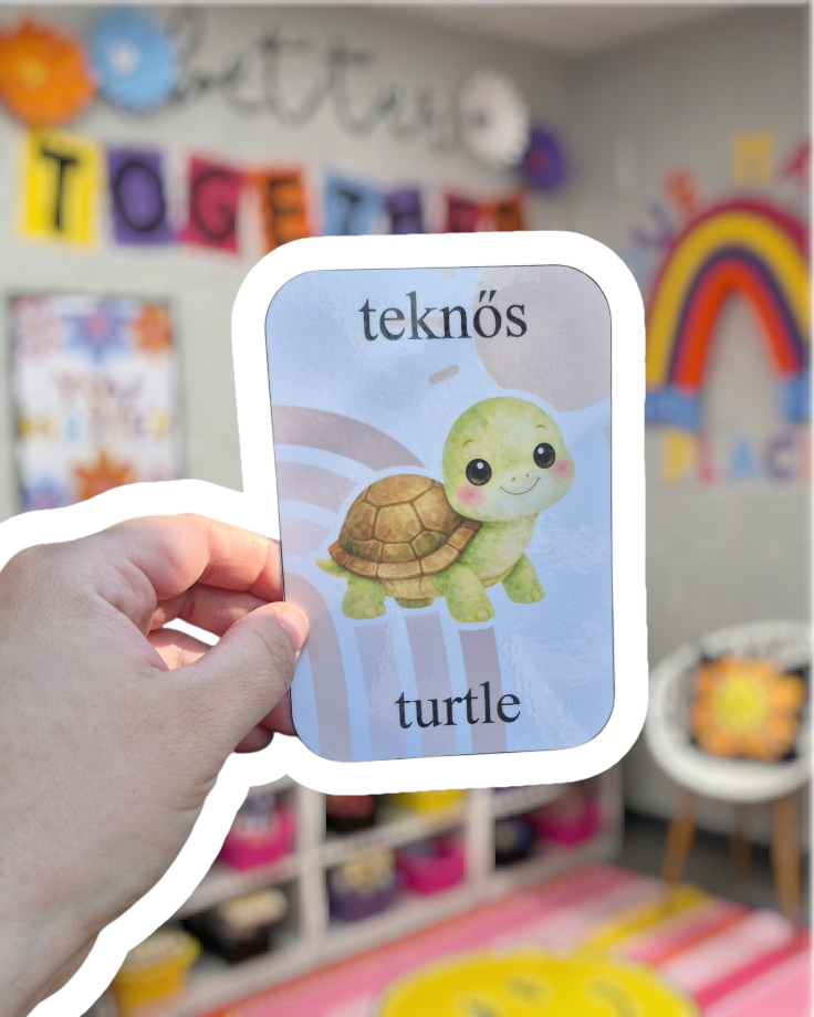 A kártyákon az állatok neve magyarul és angolul is szerepel, így a gyerekek természetes módon, vizuális támogatással ismerkedhetnek az idegen nyelvvel.