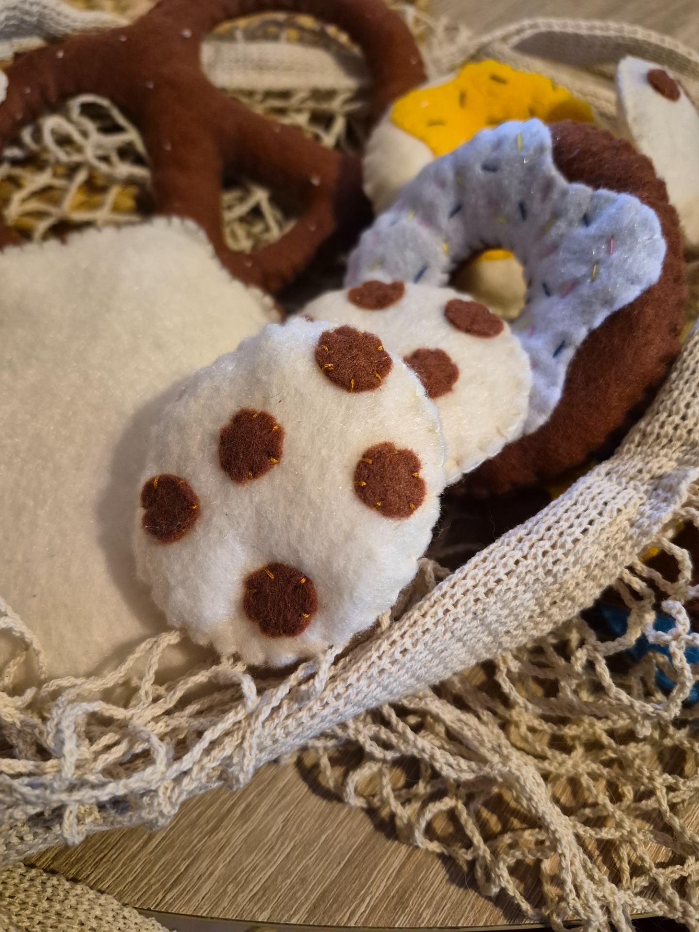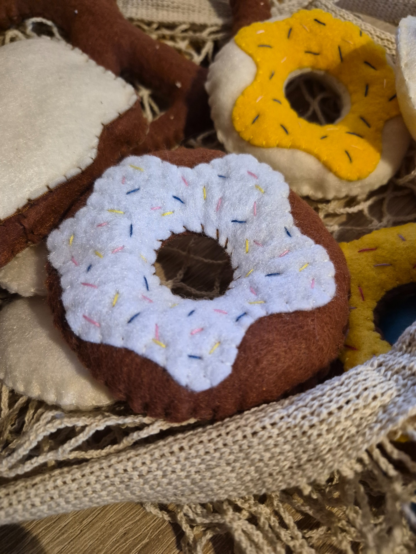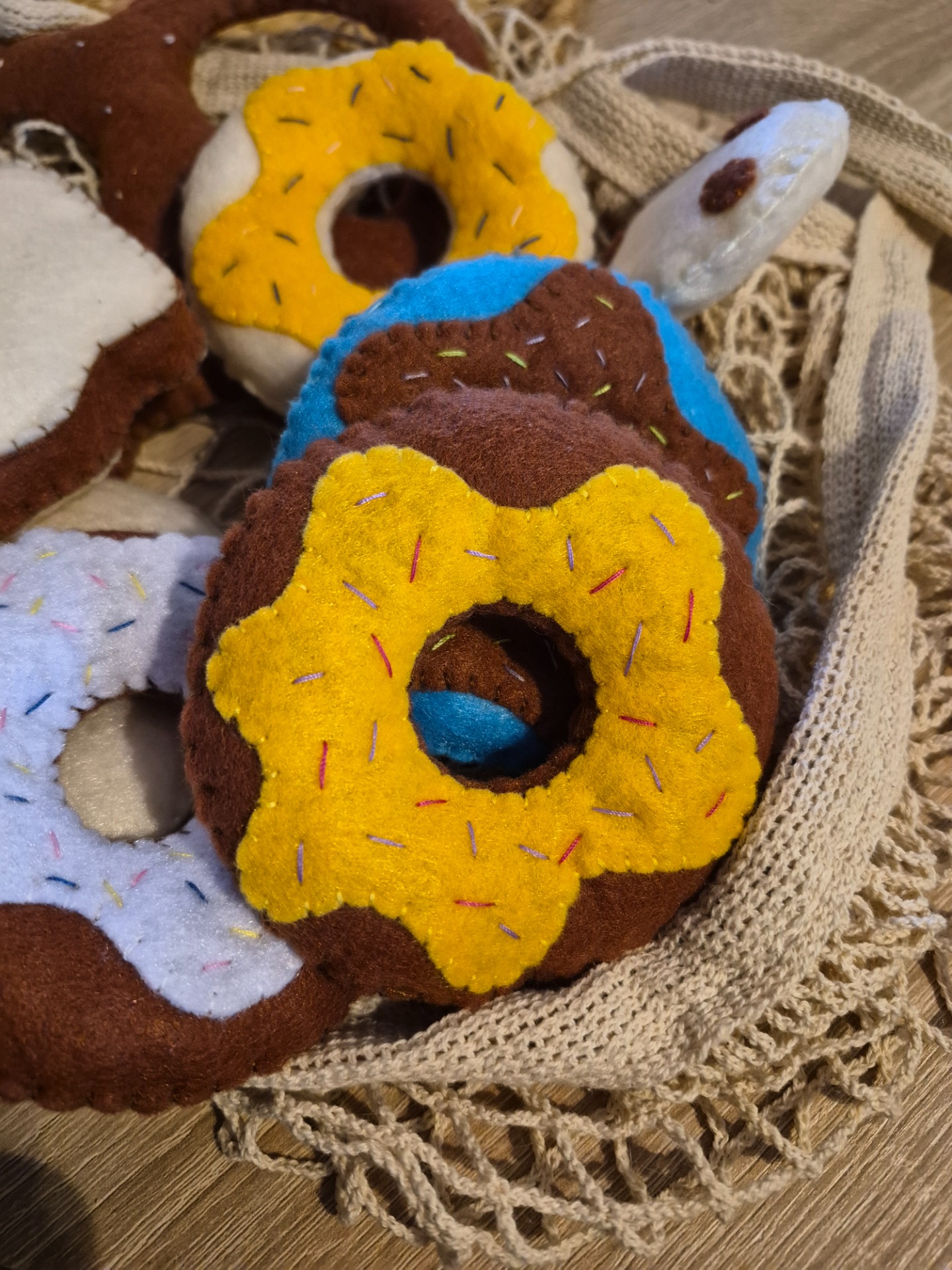 Kézzel varrt, puha filc „péksütemények”, amelyek tökéletes kiegészítői a játékkonyhának. A kis séfek örömmel készítenek velük reggelit, uzsonnát, vagy akár egy egész „pékséget” is nyithatnak otthon.
