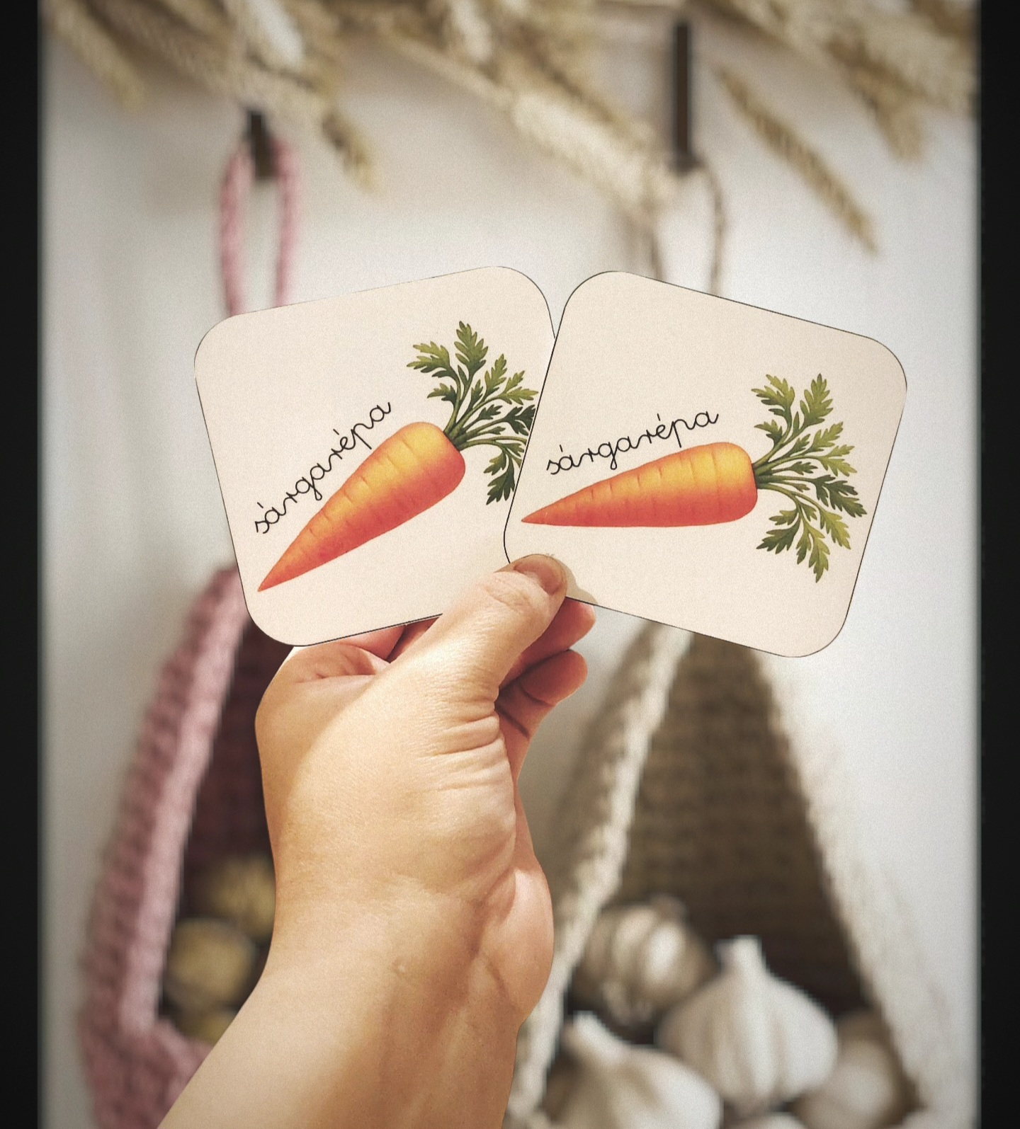 A Zöldség memória kártyacsomag játékos formában segíti a gyerekeket a különböző zöldségek felismerésében és megnevezésében.
